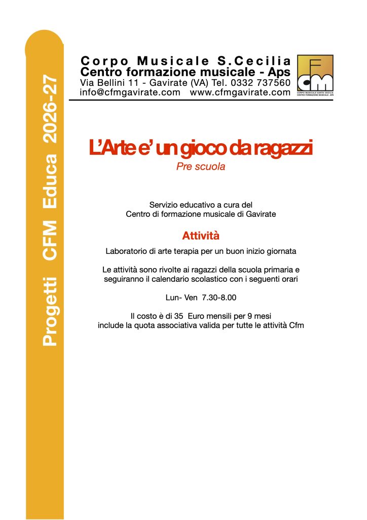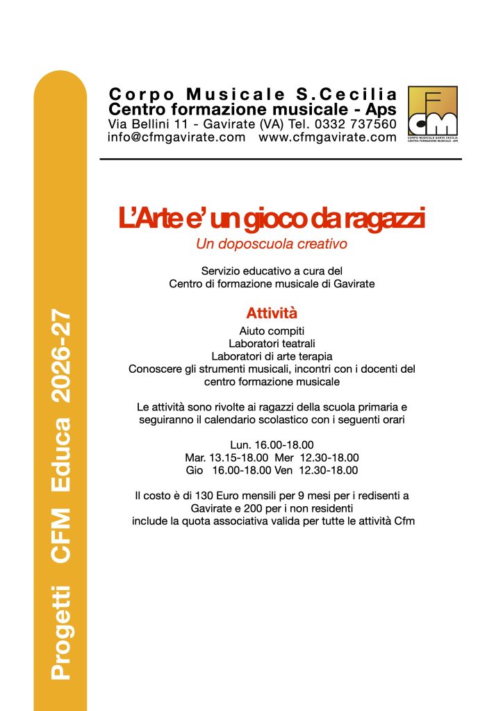 - CFMOPEN 2025Due settimane dedicate alle prove gratuite di Strumento Fin da ora è possibile prenotare un giorno e un orario tra il 01 e il 13 settembre per provare gratuitamente e conoscere i nostri insegnanti 0332737560 oppure emilio.vezzini@cfmgavirate.com 07 Settembre Giornata Open con presentazione dei corsi e della nostra scuola, aperitivo tutti insieme, prove aperte a… Leggi tutto: CFMOPEN 2025